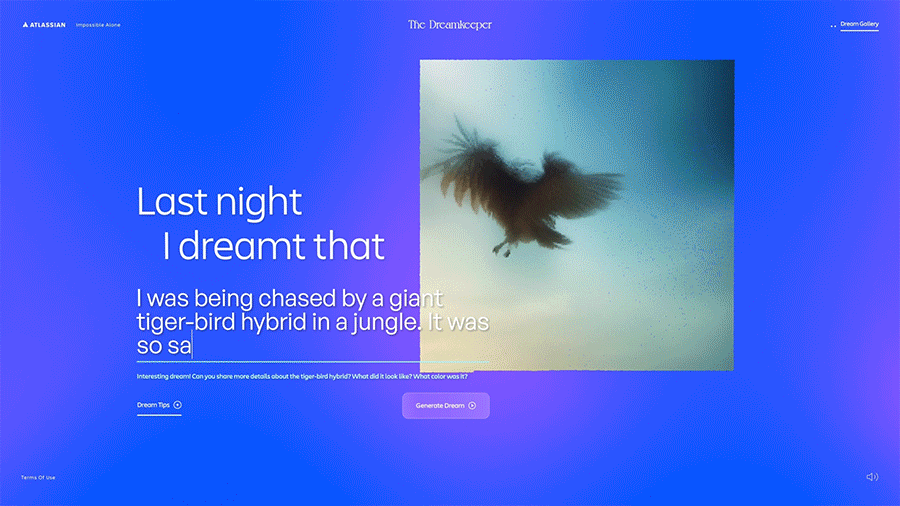 As part of Atlassian's "Impossible" project series, The Dreamkeeper is one of three extraordinary creations. We collaborated with dream scientists, developers, and AI experts to design an engaging web application that employs generative AI to convert individuals' dreams into animated visuals .